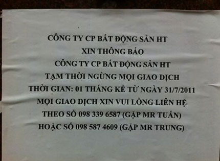 Nhiều khách hàng khi tìm đến văn phòng của sàn bất động sản HT (nơi thu tiền chênh của khách hàng góp vốn vào dự án CT1) tại Trung Yên – Cầy Giấy mới tá hỏa khi thấy văn phòng này đã đóng cửa cả tháng nay. Ngoài cửa văn phòng dán thông báo sàn HT tạm ngừng hoạt động. Liên hệ qua số điện thoại dán trên tờ thông báo thì được trả lời tháng 7 âm lịch sàn đóng cửa cho nhân viên đi nghỉ mát!