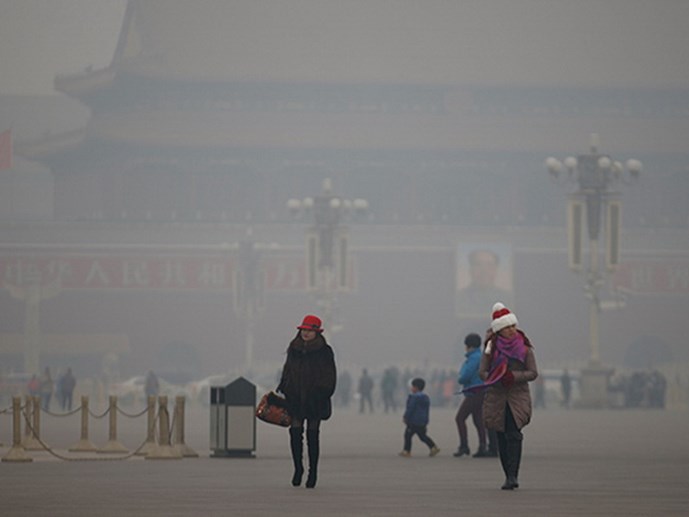 Người dân Trung Quốc dạo bước trong bầu trời mờ mịt khói mù ô nhiễm tại Quảng trường Thiên An Môn ở Bắc Kinh - Ảnh: Reuters