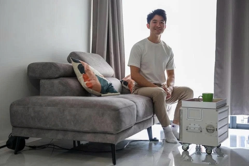 Phua, cựu tiếp viên hàng không, ngồi ăn tại chiếc bàn cà phê được cải tạo từ xe đẩy bếp trên máy bay, có thể di chuyển để làm bàn phụ. Một gờ tường cạnh giường ngủ vừa làm bàn làm việc vừa làm không gian lưu trữ.