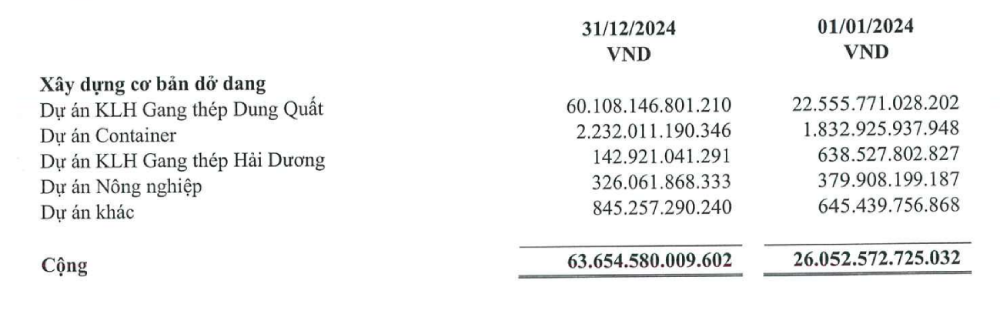 Hòa Phát đã rót thêm vào dự án Dung Quất 2 gần 38.000 tỉ đồng, qua đó nâng tổng vốn đầu tư lũy kế đã giải ngân đến ngày 31/12/2024 lên 60.100 tỉ đồng. Nguồn: BCTC HPG