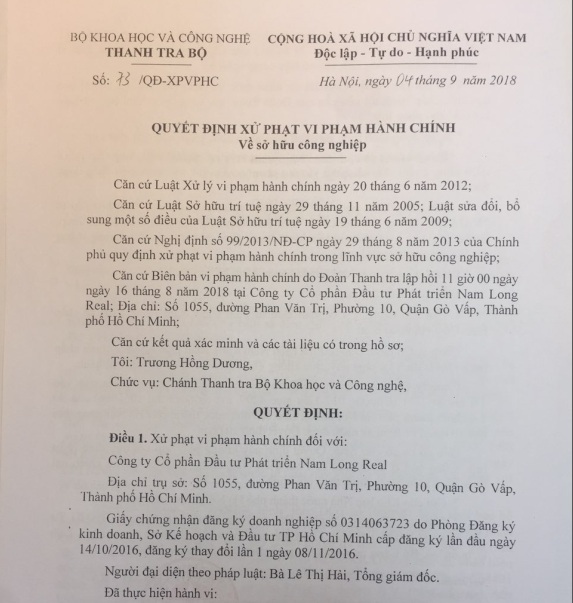 Ngày 4/9, Chánh thanh tra Bộ Khoa học và Công nghệ đã ban hành Quyết định xử phạt vi phạm hành chính 20 triệu đồng đối với Nam Long Real, do thực hiện hành vi xâm phạm quyền sở hữu trí tuệ đối với nhãn hiệu "Nam Long" đang được bảo hộ độc quyền của Công ty cổ phần Đầu tư Nam Long.