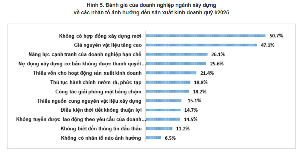 Trong đó, có 50,7% doanh nghiệp nhận định không có hợp đồng xây dựng mới là yếu tố ảnh hưởng đến sản xuất kinh doanh trong quý 1/2025. Tương tự, có 47,1% doanh nghiệp cho rằng giá nguyên vật liệu tăng cao là yếu tố ảnh hưởng đến hoạt động sản xuất kinh doanh trong giai đoạn vừa qua.