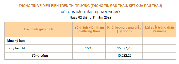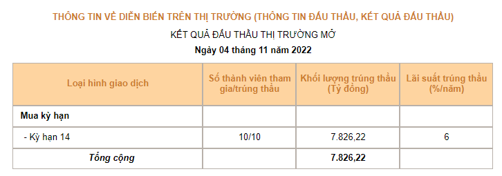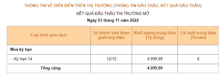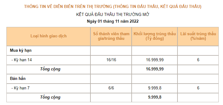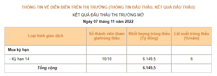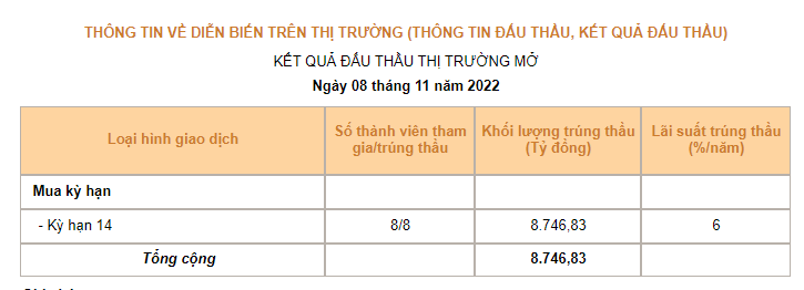 Ngày 8/11, Ngân hàng Nhà nước bơm qua thị trường mở hơn 8.746 tỷ đồng. 8 thành viên đã trúng thầu với lãi suất 6%/năm, kỳ hạn 14 ngày. .