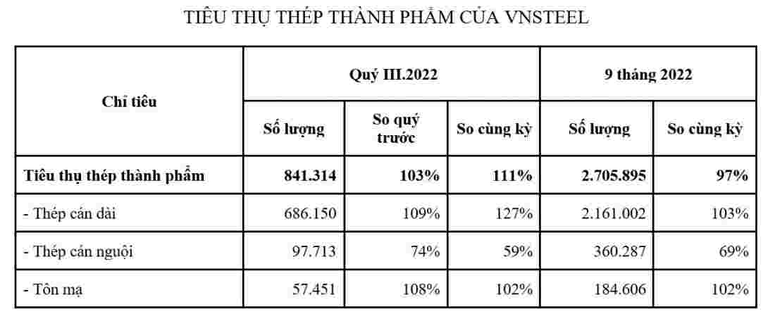 Cụ thể, tổng tiêu thụ thép thành phẩm của toàn hệ thống VNSteel trong quý 3 đạt 841.314 tấn, tăng 3% so với quý trước và tăng 11% so với cùng kỳ năm 2021.