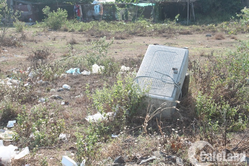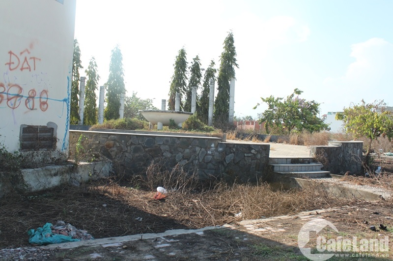 Một khu đất nhỏ dành để xây dựng đài nước, nhà dừng chân bị cỏ dại bao vây, công trình hư hỏng, loang lỗ. “Lúc tôi mua nhà thì chủ đầu tư cam kết đảm bảo về hạ tầng, an ninh và các tiện ích bên trong của dự án nhưng đã nhiều năm qua dự án chỉ để cỏ mọc, nhếch nhách trong khi hạ tầng, tiện ích lại không có”, một người dân bức xúc.