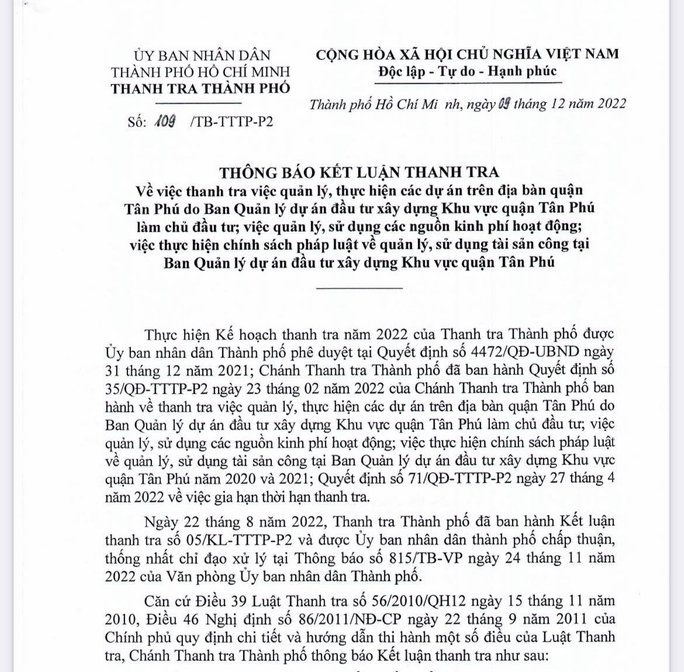 Chánh Thanh tra TP kiến nghị và được chủ tịch UBND TP kết luận giao chủ tịch UBND quận Tân Phú chỉ đạo giám đốc Ban Quản lý dự án đầu tư xây dựng Khu vực quận Tân Phú kiểm tra, rà soát và chịu trách nhiệm trong việc thực hiện các hoạt động tại đơn vị. Đồng thời, chủ trì tổ chức kiểm điểm, xác định trách nhiệm các cá nhân, tổ chức có liên quan về các hạn chế, thiếu sót của Ban Quản lý dự án đầu tư xây dựng Khu vực quận Tân Phú...