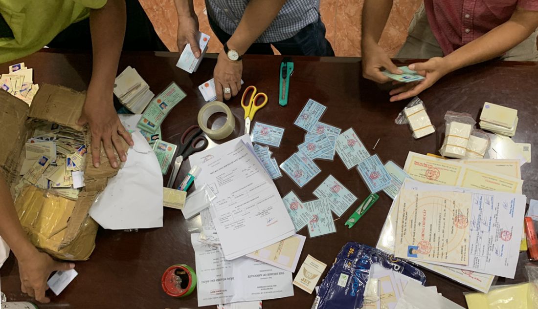 Trước đó, cuối tháng 8-2020, Cục Cảnh sát hình sự Bộ Công an đã triệt phá thành công đường dây làm giả giấy tờ, bằng cấp, biển số xe, con dấu quy mô lớn, bắt khẩn cấp 20 nghi phạm. Cụ thể, trong căn nhà nằm giữa con hẻm sâu gần sân golf Long Thành (Đồng Nai), lực lượng chức năng bắt giữ 2 nghi phạm là Nguyễn Trọng Dương (30 tuổi, quê Nghệ An) và Nguyễn Văn Đạt (quê Lâm Đồng) đang sản xuất nhiều loại giấy tờ giả. Tại hiện trường, C02 thu giữ hàng ngàn tang vật gồm: bằng lái xe, biển số xe các loại, chứng minh thư nhân dân, thẻ căn cước, bằng đại học, bằng ngoại ngữ, giấy đăng kiểm...