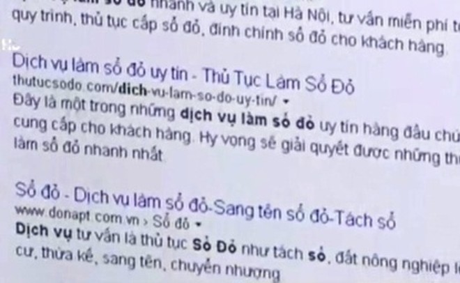 Chỉ cần gõ từ khóa “dịch vụ làm sổ đỏ” trên các trang tìm kiếm, hàng loạt các lời mời chào làm dịch vụ sổ đỏ hấp dẫn sẽ hiển thị ngay sau vài giây.