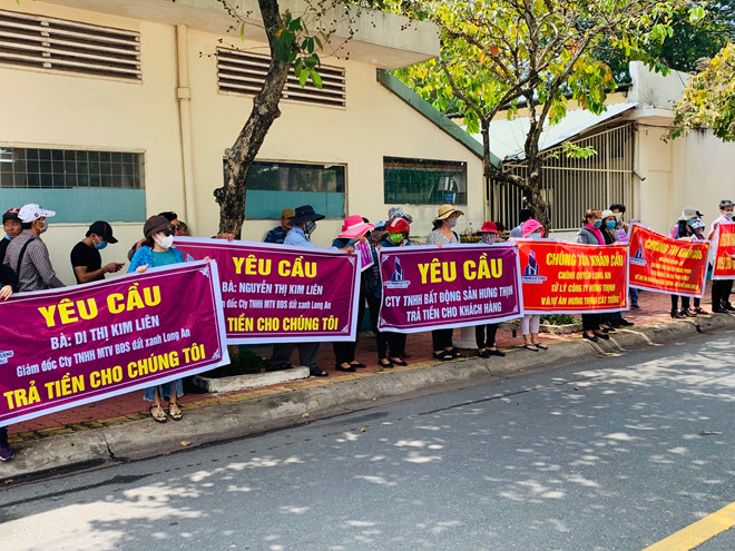 Đầu tháng 10/2019, rất đông người dân tập hợp tại trụ sở UBND tỉnh Long An, căng băng rôn để yêu cầu cơ quan chức năng vào cuộc xử lý một số cá nhân, công ty bất động sản có dấu hiệu lừa đảo, chiếm đoạt tài sản. Ông V, một người mua đất nền tại dự án Hưng Thịnh Cát Tương II (xã Mỹ Hạnh Nam, huyện Đức Hòa, Long An), cho biết giữa năm 2018, ông ký hợp đồng nguyên tắc đầu tư chuyển nhượng quyền sử dụng đất tại dự án Hưng Thịnh Cát Tường II với Công ty TNHH Một thành viên Bất động sản Đất Xanh Long An do bà Nguyễn Thị Kim Liên làm đại diện pháp luật.