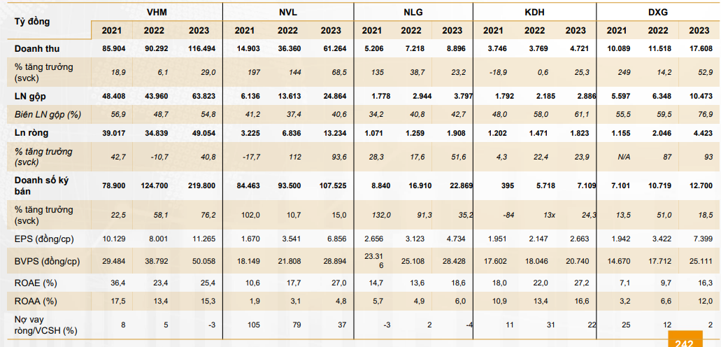 Tóm tắt dự phóng kết quả kinh doanh 2022-2023 các cổ phiếu bất động sản nhà ở trong danh mục theo dõi của VnDirect.