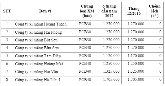 Giá xi măng 6 tháng đầu năm 2017 cơ bản ổn định so với cuối năm 2016 do giá nguyên liệu đầu vào, chi phí sản xuất cơ bản ổn định nên các nhà máy sản xuất kinh doanh xi măng giữ ổn định giá bán. Giá bán tại các nhà máy cụ thể như sau: