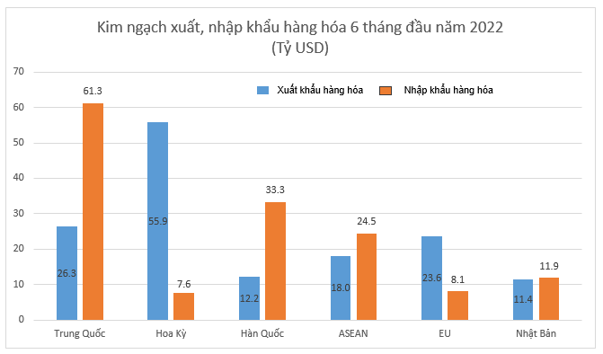 Về thị trường xuất, nhập khẩu hàng hóa 6 tháng đầu năm 2022, Hoa Kỳ là thị trường xuất khẩu lớn nhất của Việt Nam với kim ngạch ước đạt 55,9 tỷ USD. Trung Quốc là thị trường nhập khẩu lớn nhất của Việt Nam với kim ngạch ước đạt 61,3 tỷ USD.