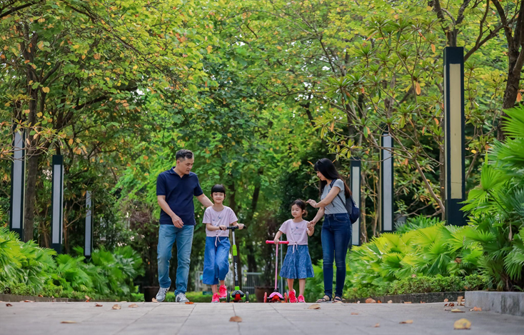 Bởi lẽ, từ cổng vào cho tới những con đường nội khu, dọc làn đường dành cho người đi bộ, và những công viên, cây và hoa được trồng và tỉa tót tỉ mỉ, tạo nên những tiểu cảnh và một thảm thực vật dày, khiến cho chúng tôi như bước trong một khu bảo tồn thiên nhiên với nhiệt độ mát mẻ, luôn thấp hơn bên ngoài. Trẻ con thì thoải mái chạy nhảy, chơi đùa dưới bóng cây, người lớn chúng tôi tản bộ đầy thích thú dọc những con đường thanh bình, yên tĩnh không khói bụi hay còi xe xô bồ.