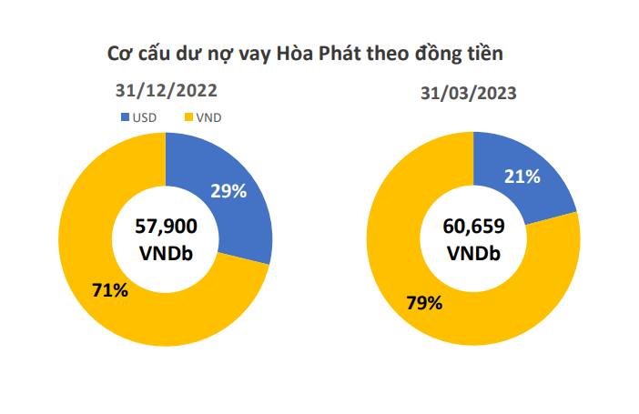 Doanh nghiệp này cho biết, khi lãi suất đồng USD tăng và dự kiến chưa giảm trong ngắn hạn, Hòa Phát vẫn ưu tiên dành tỷ trọng lớn hơn cho các khoản vay bằng Đồng Việt Nam. Việc giữ tỷ trọng nợ vay ngoại tệ USD ở mức độ vừa phải giảm rủi ro tỷ giá, đồng thời giảm nhẹ gánh nặng về chi phí lãi vay.