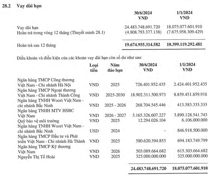 Đối với dư nợ vay dài hạn cuối kỳ là 19.675 tỉ đồng, tăng 89% so với đầu năm và tăng 22% sau một quý. Các khoản vay dài hạn chủ yếu đáo hạn vào giai đoạn 2025 - 2030 và hoàn toàn bằng VND với mức lãi suất từ 2,48% đến 7,5%, cũng giảm sâu so với lãi suất hồi đầu năm (2,6% - 12%/năm).