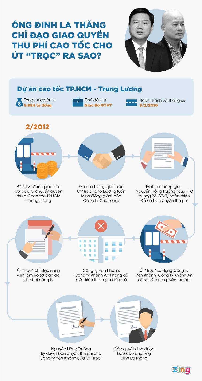 Ông Đinh La Thăng bị cáo buộc đã chỉ đạo cấp dưới tạo điều kiện cho công ty của Út "Trọc" trúng đấu giá quyền thu phí cao tốc TP.HCM - Trung Lương, gây thiệt hại 725 tỷ đồng.