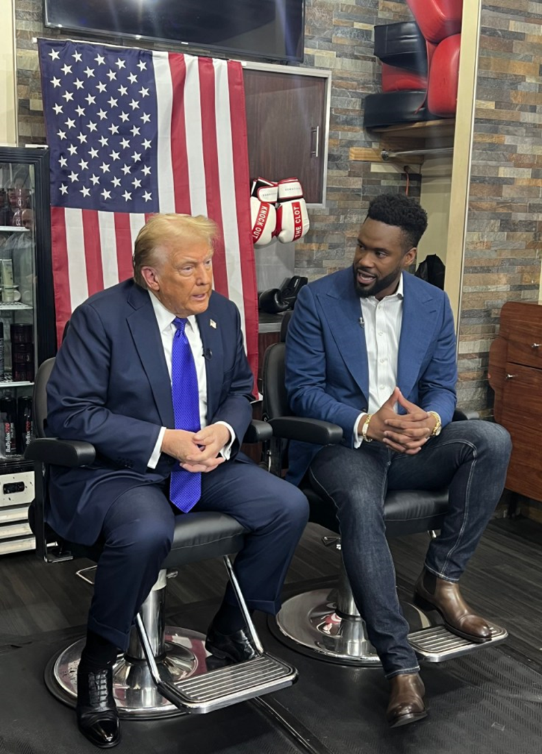 Cựu Tổng thống Donald Trump và phóng viên của Fox Lawrence Jones ngồi trên ghế cắt tóc trong một cuộc phỏng vấn tại Knockout Barbershop trên Đại lộ Castle Hill, Bronx, NY.
