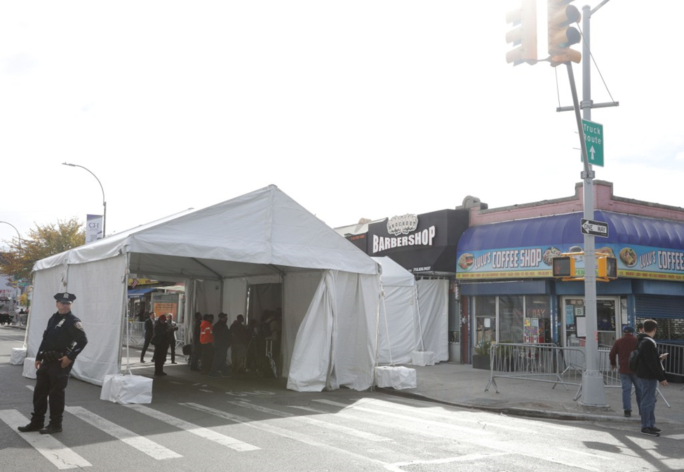 Nhưng tầm nhìn của những người chứng kiến đã bị chặn bởi một chiếc lều dựng trên lối vào tiệm, một nỗ lực rõ ràng của các mật vụ nhằm bảo vệ ông Trump, người đã chứng kiến hai vụ ám sát gần đây.