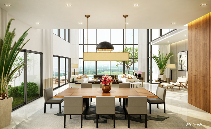 Mọi tính toán về thiết kế đều được cân nhắc cẩn trọng để ánh nắng có thể chạm vào từng góc nhỏ của căn hộ. Từ chiếc ghế sofa sang trọng, chủ nhân có thể phóng tầm mắt và tận hưởng cảnh sông Sài Gòn rộng mở hiện ngay trước mắt nhờ tất cả các cửa đều được thiết kế bằng kính sáng bóng dài đến 7,2 m. Đây là chiều cao đáng mơ ước, khó có thể tìm thấy ở những công trình cao cấp khác, giúp cư dân được tận hưởng thiên nhiên một cách trọn vẹn hơn.
