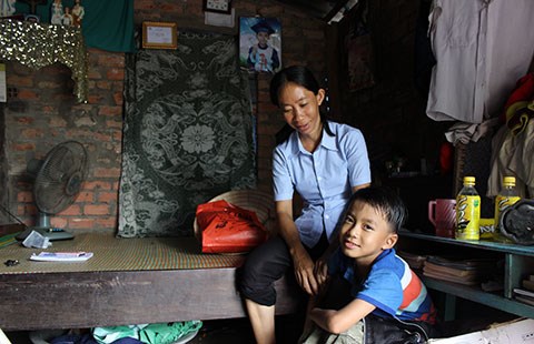 Trong căn nhà tuềnh toàng nền đất chưa đầy 10 m2, em Kiều Minh Tuấn (sáu tuổi), con trai chị Kiều Thị Ánh Liên đang chăm chỉ làm bài tập trên chiếc bàn gỗ cũ kỹ. Năm năm trước, chồng chị đã bỏ đi, để mặc chị cáng đáng nuôi ba đứa con. Thấy hoàn cảnh của chị, một người tốt bụng mới cho chị ở tạm căn chòi trong nghĩa địa.