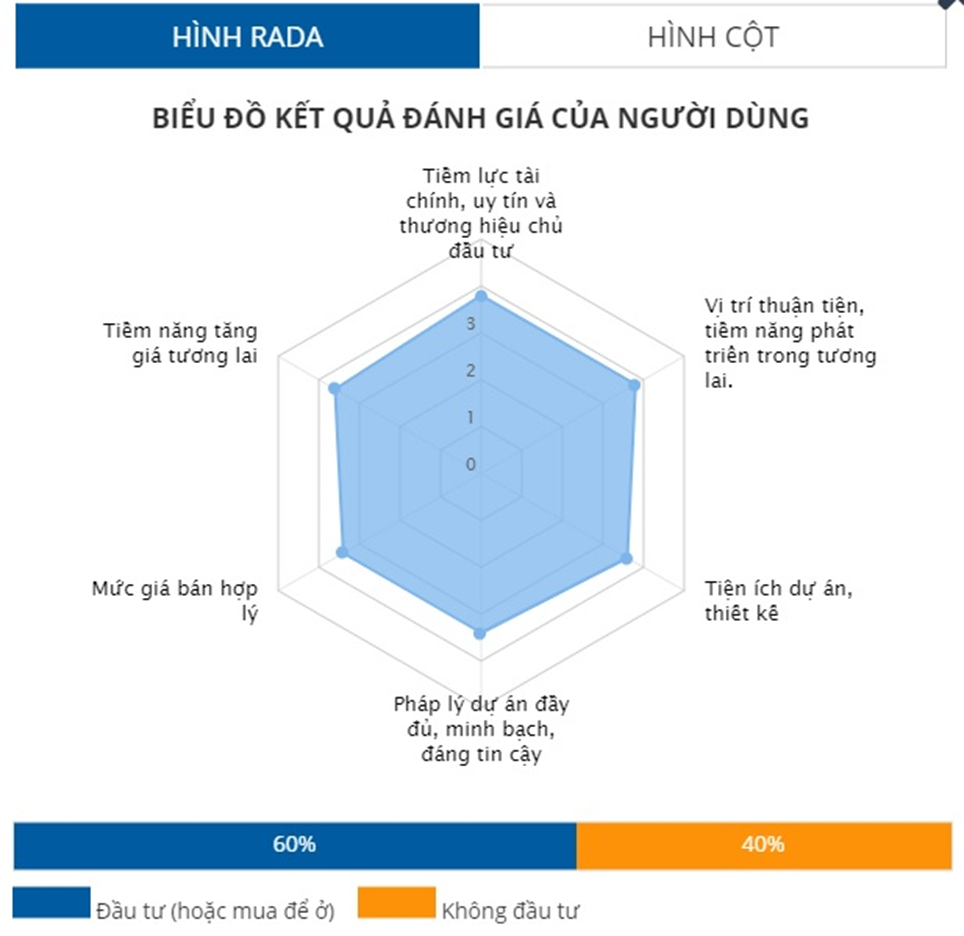 Theo biểu đồ đánh giá ở trên, dự án được đánh giá cao về tiềm lực tài chính và tiện ích với 4,5/5 điểm. Về tiêu chí vị trí thuận tiện và tiềm năng, dự án được độc giả đánh giá với thang điểm 4,3 và 4/5. Hai tiêu chí còn lại lần lượt là pháp lý 3,8/5 điểm và mức giá 3,5/5 điểm.