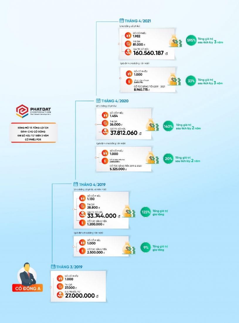 Nhờ kết quả kinh doanh vô cùng ấn tượng, cổ đông có được nhiều lợi ích khi diễn biến giá cổ phiếu trong những năm qua cho thấy giá trị đem lại của cổ phiếu thưởng cao hơn cổ tức bằng tiền. Để có thể thấy rõ được các ưu điểm vượt trội, chúng ta giả định cổ đông A sở hữu 1.000 cổ phiếu PDR thời điểm tháng 03/2019 được minh họa như sau: