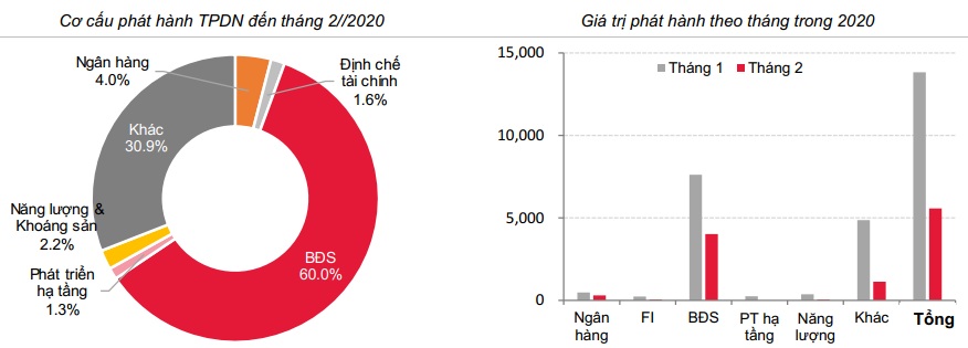 Tính trong 2 tháng đầu năm 2020, các doanh nghiệp bất động sản đã phát hành 11.639 tỷ đồng trái phiếu, chiếm 60% tổng lượng trái phiếu doanh nghiệp.