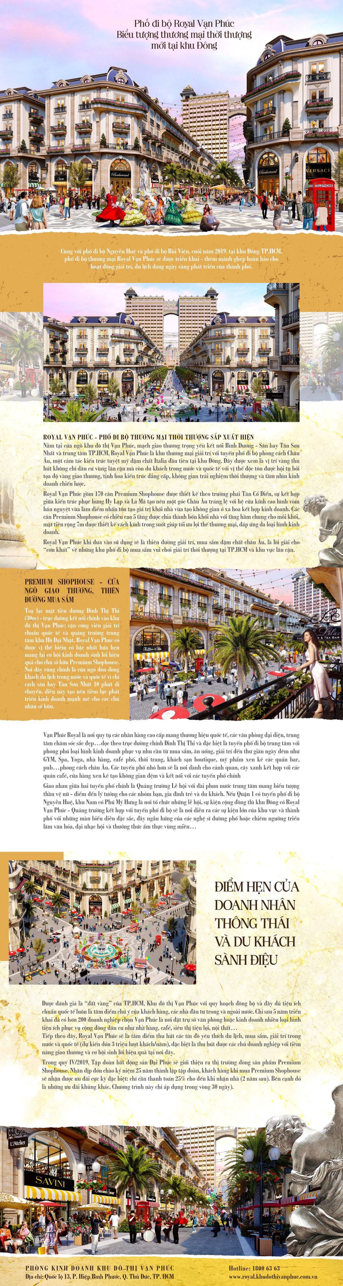 Cùng với phố đi bộ Nguyễn Huệ và phố đi bộ Bùi Viện, cuối năm 2019, tại khu Đông TP.HCM, phố đi bộ thương mại Royal Vạn Phúc sẽ được triển khai – thêm mảnh ghép hoàn hảo cho hoạt động giải trí, du lịch đang ngày càng phát triển của thành phố.