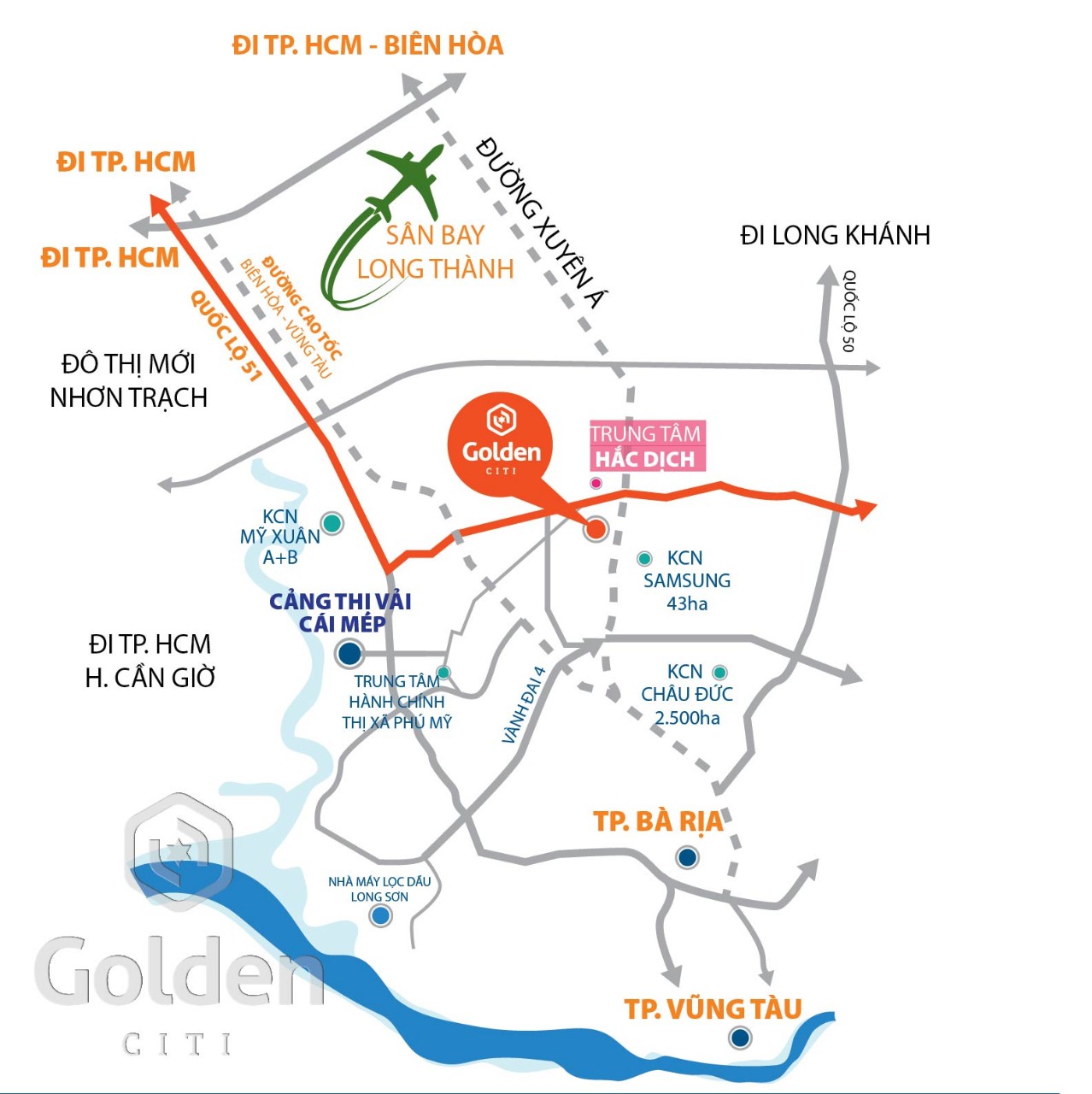 Golden Citi có vị trí chỉ cách các tiện ích của phường Hắc Dịch như chợ, trường học...trong bán kính tầm 500m. Hiện tại, từ Golden Citi, các nhà đầu tư có thể kết nối nhanh chóng đến các điểm quan trọng như Cảng Thị Vải – Cái Mép (cách 7km), sân bay Long Thành (15ph), thành phố Bà Rịa (15ph) và TP.HCM (45ph). Đến năm 2019, khi cao tốc Bến Lức – Long Thành được thông xe, cư dân tại dự án còn có thể kết nối nhanh chóng về miền Tây.