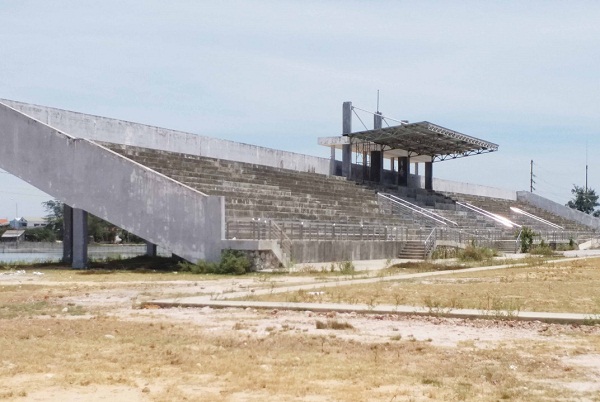 Mặt sân vận động gồ ghề, cỏ dại mọc um tùm