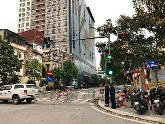 Đoạn đường khu vực nhà 8B Lê Trực được phong tỏa để lắp đặt cẩu tháp chuẩn bị tiến hành phá dỡ tầng 18. Ảnh: TRỌNG PHÚ