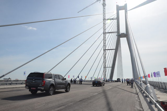 Trong đó, phần cầu có chiều dài 515m với quy mô vĩnh cửu, gồm 04 làn xe cơ giới, bề rộng cầu 23,6m. Kết cấu nhịp chính cầu dây văng gồm 02 nhịp đối xứng, thi công theo phương pháp đúc hẫng cân bằng; hệ dây văng gồm 56 dây được bố trí theo 02 mặt phẳng hình rẽ quạt.