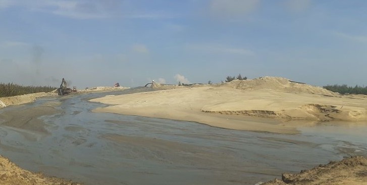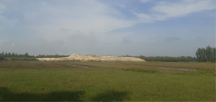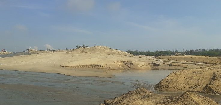Việc đẩy nhanh tiến độ nạo vét lòng sông Cổ Cò dẫn đến bãi tập kết cát đã cao hàng chục mét càng thêm cao. Bãi tập kết cát vẫn được nhìn thấy rõ dù ở xa hàng km.