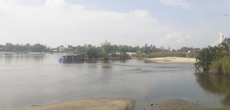 Hiện trường dự án, các sà lan hút cát đang đẩy nhanh tiến độ nạo vét lòng sông, đoạn giáp ranh giữa thành phố Hội An và thị xã Điện Bàn