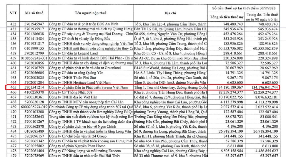 Syrena Việt Nam nợ thuế quá 90 ngày với tổng số tiền lên đến hơn 134 tỷ đồng. Nguồn: Cục Thuế tỉnh Quảng Ninh