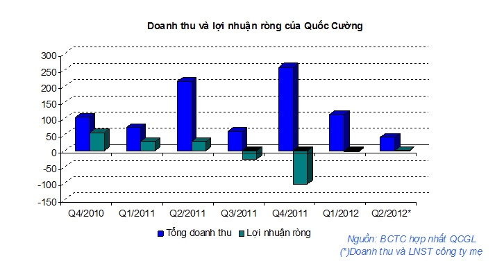 Hiệu quả kinh doanh Quốc Cường Gia Lai trong thời gian gần đây hết sức tệ hại. Liên tục bị thua lỗ từ Qúy 3/2011 đến Qúy 1/2012. Riêng trong Quý 2/2012, doanh thu của công ty mẹ đạt 42,14 tỷ đồng, tăng mạnh so với cùng kỳ nhưng lợi nhuận sau thuế chỉ đạt vỏn vẹn 361 triệu đồng.