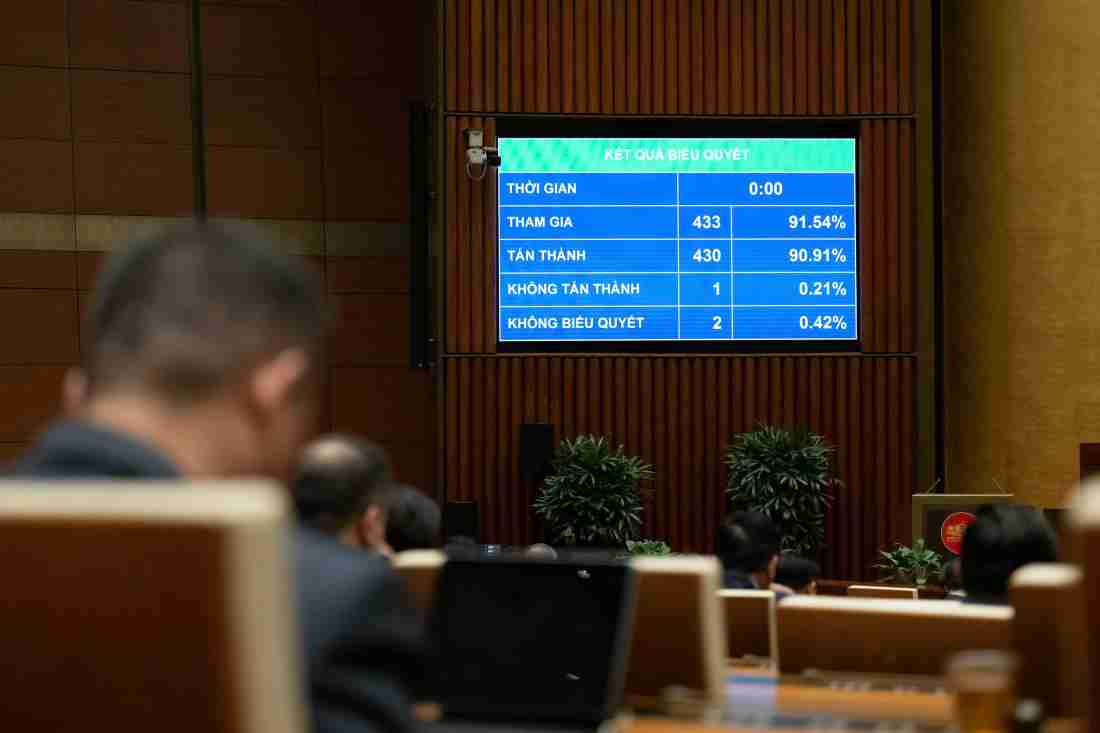 Kết quả cho thấy, có 430/433 ĐBQH có mặt tham gia biểu quyết (chiếm tỷ lệ 90,91% tổng số ĐBQH) tán thành với việc thông qua Nghị quyết. Ảnh: Quochoi.vn