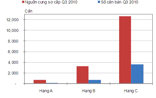 Nguồn cầu căn hộ chủ yếu đến từ phân khúc có giá trung bình dưới 1.000USD/m2, với khoảng 3.300 căn hộ đã bán, chiếm khoảng 74% tổng lượng căn hộ tiêu thụ trong quý 3/2010.