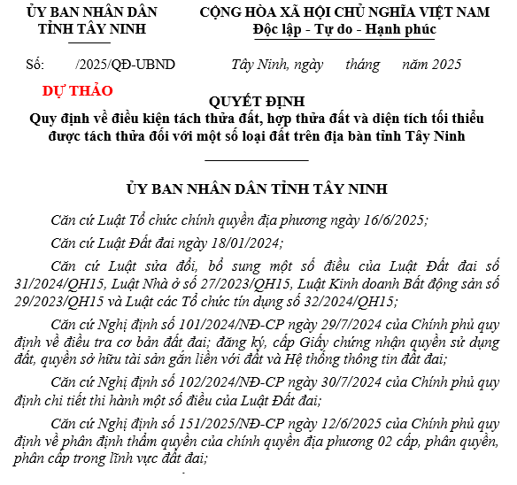 Từ ngày 25/10/2024, các quy định về điều kiện, diện tích tối thiểu của việc tách thửa đất, hợp thửa đất đối với từng loại đất trên địa bàn tỉnh Tây Ninh sẽ được thực hiện theo Quyết định 49/2024/QĐ-UBND.