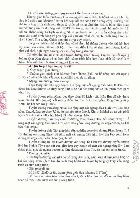 Như vậy, theo anh T, dựa trên Quyết định số 1066/QĐ-UBND của UBND TP.à Nội, ngày 06/03/2012 "Về việc điều chỉnh tổng thể quy hoạch chi tiết khu đất xây dựng công trình có công năng hỗn hợp Đại Thanh - tỷ lệ 1/500. Địa điểm tại xã Tả Thanh Oai, huyện Thanh Trì, Hà Nội", có nội dung: "Tại các khu đất có vị trí dọc tuyến đường Phan Trọng Tuệ có mặt cắt ngang đường rộng 50m được bố trí khối công trình hỗn hợp (cao nhất là 29 tầng) làm điểm nhấn kiến trúc cho trục đường và khu vực".