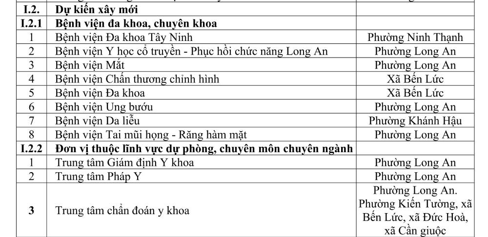 Song song đó, tỉnh Tây Ninh quy hoạch xây dựng mới nhiều cơ sở y tế quan trọng như: Bệnh viện Đa khoa Tây Ninh; Bệnh viện Y học cổ truyền - Phục hồi chức năng Long An; Bệnh viện Mắt; Bệnh viện Chấn thương chỉnh hình; Bệnh viện Ung bướu; Bệnh viện Da liễu; Bệnh viện Tai mũi họng - Răng hàm mặt; Trung tâm Giám định Y khoa; Trung tâm Pháp y; Trung tâm Chẩn đoán y khoa.