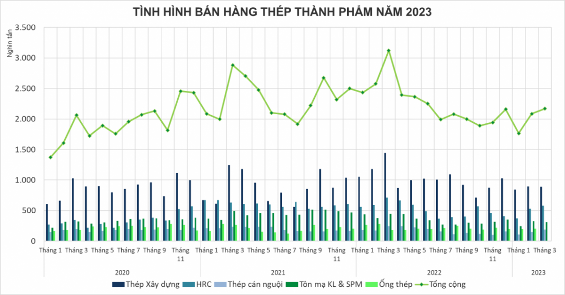 Tính chung 3 tháng đầu năm, sản xuất thép xây dựng đạt 2,7 triệu tấn, giảm 23% so với cùng kỳ năm 2022. Bán hàng thép xây dựng đạt 2,6 triệu tấn, giảm 28,5% so với cùng kỳ, trong đó xuất khẩu đạt 422.000 tấn, giảm 41% so với cùng kỳ năm ngoái.