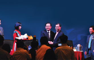 Ông Trầm Bê trao hoa tạm biệt ông Phạm Hữu Phú, đại diện của Eximbank giữ vị trí Chủ tịch Hội đồng Quản trị Sacombank. Ảnh: Dũng Nguyễn