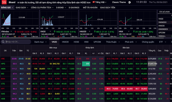 Bảng điểm của sàn HoSE lại bị đơ nặng trong phiên 9-6 - Ảnh: chụp màn hình