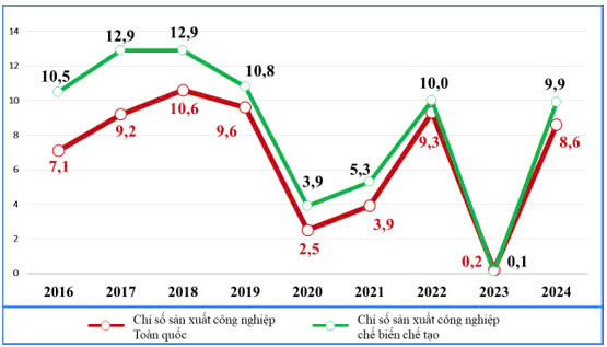 Tính chung 9 tháng năm 2024, chỉ số sản xuất công nghiệp (IIP) ước tính tăng 8,6% so với cùng kỳ năm trước (cùng kỳ năm 2023 chỉ tăng 0,3%). Trong đó, ngành chế biến, chế tạo tăng 9,9%; ngành sản xuất và phân phối điện tăng 11,1% ; ngành cung cấp nước, hoạt động quản lý và xử lý rác thải, nước thải tăng 9,9%; riêng ngành khai khoáng giảm 6,5% (cùng kỳ năm 2023 giảm 3%).