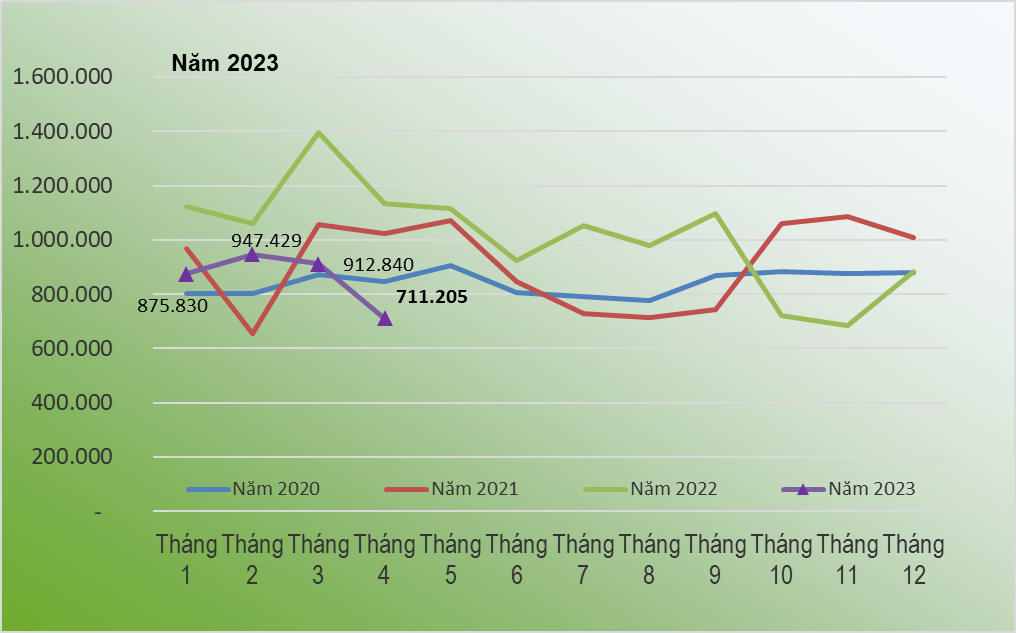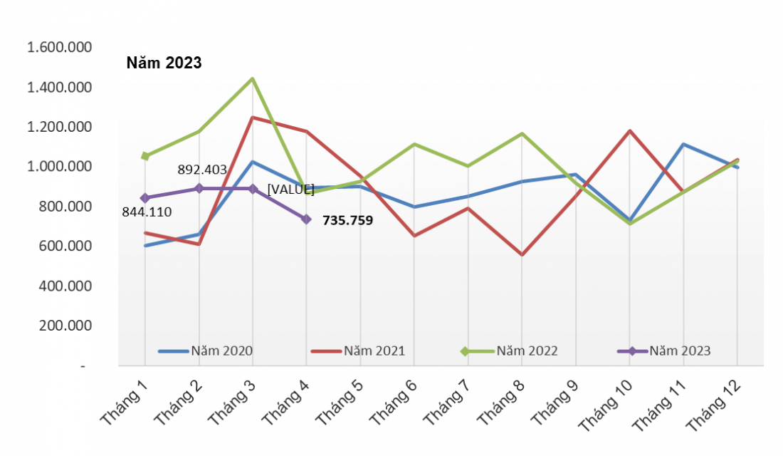 Lũy kế 4 tháng đầu năm, sản xuất thép thành phẩm của cả nước đạt gần 8,9 triệu tấn, giảm 22,4% so với cùng kỳ năm 2022. Trong khi đó, tiêu thụ thép thành phẩm ở mức 8,1 triệu tấn, giảm 23,1% so với cùng kỳ năm. Trong đó xuất khẩu đạt 2,3 triệu tấn, giảm 6,2% so với cùng kỳ năm ngoái.