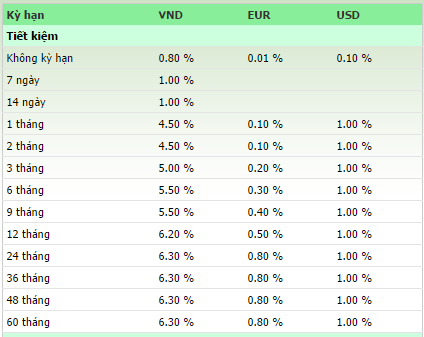 Cụ thể, lãi suất tiền gửi kỳ hạn 1 tháng cũng chỉ còn 4,5%/năm, kỳ hạn 2 tháng là 4,8%/năm, kỳ hạn 3 tháng là 5,5%/năm và mức lãi suất huy động cao nhất là 7,2%/năm cho kỳ hạn 12 tháng.