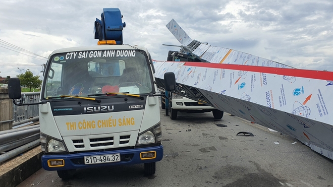 Lúc này trên cầu có 2 xe tải của đội thi công. Vụ tai nạn làm hư hỏng 2 xe, rất may không xảy ra thương vong về người.