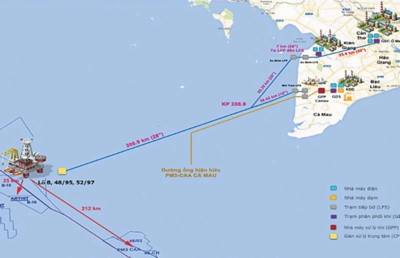 Theo đó, doanh nghiệp này và các đối tác sẽ xây dựng hệ thống đường ống dẫn khí trên biển, trên bờ dài khoảng 431 km, cùng với các trạm tiếp bờ, trạm phân phối khí, trạm van, các công trình phụ trợ… để đưa khí từ Lô B về Trung tâm điện lực Ô Môn (TP Cần Thơ).