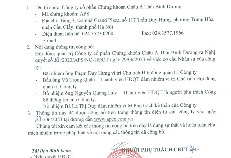 Ngoài ra, HĐQT APS cũng bầu ông Nguyễn Quang Huy - Thành viên HĐQT là người phụ trách Công bố thông tin và bà Lã Thị Quy đảm nhiệm vị trí Phụ trách kế toán APS từ ngày 29/06.